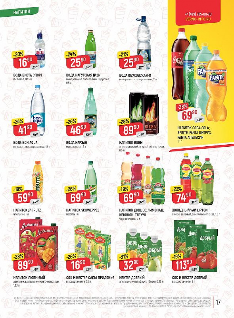 Акции в Верном, которые будут размещены в новом каталоге с 5 по 11 июня 2018 года помогут своим поклонникам выбрать выгодные товары по спецценам в Екатеринбурге. Скидки на продуктовые и хозяйственные товары могут достигать до 50%, но в основном это 20-30%, что тоже не плохо.
