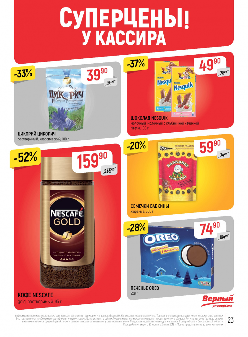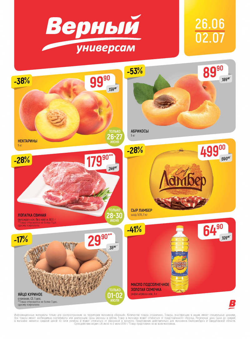 Акции в Верном, которые будут размещены в новом каталоге с 26 июня по 2 июля 2018 года помогут своим поклонникам выбрать выгодные товары по спецценам в Екатеринбурге. Скидки на продуктовые и хозяйственные товары могут достигать до 50%, но в основном это 20-30%, что тоже не плохо.
